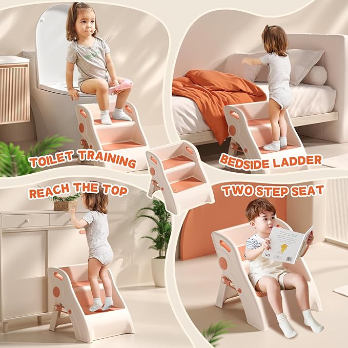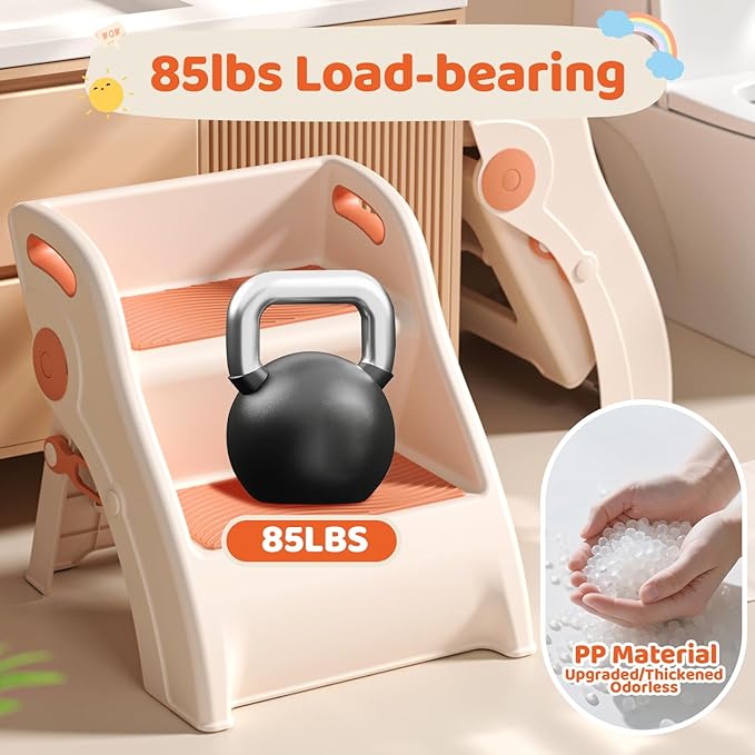 - Anti-slip, Eco-friendly & Sturdy Design: Our toddler step stool is made of thickened, eco-friendly PP material (BPA-free), with non-slip rubber steps, anti-tip triangular base and smooth rounded handles for maximum toddler safety. Allowing your baby to start an independent journey with confidence.