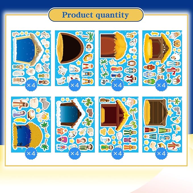 - Christmas Craft Activities: Includes 32 beautifully crafted sticker sheets featuring the Holy Family, angels, shepherds, animals, and biblical scenery
