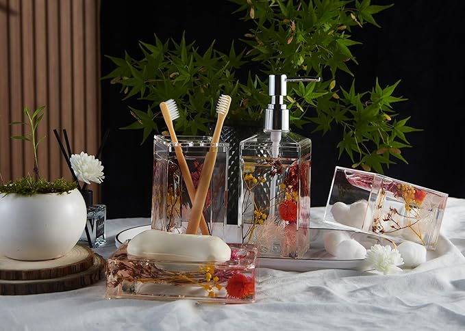 Locco Decor Bathroom Vanity Accessory Set Acrylic Liquid 3D Floating Motion Toothbrush Holder, Tumbler, Soap Dispenser, Soap Dish, Toilet brush, 5-Piece Accessory Set Garden Botanic Pink Plants