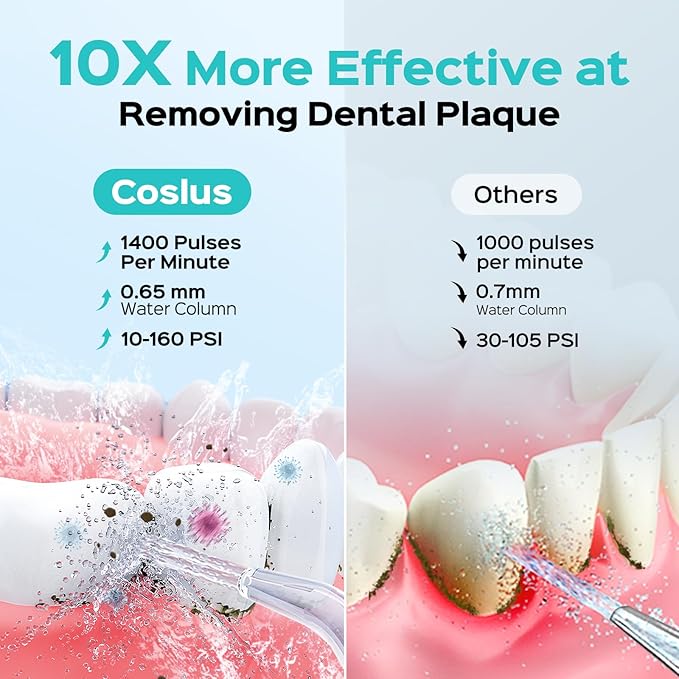 - Excellent Deep Cleaning Sets New Standard: COSLUS water flosser is the product of six years of research and development, passed multiple certifications. Utilizes advanced high-pressure pulsation technology and offers adjustable water pressure from 10-160 psi. Effectively clean plaque and penetrates hard-to-reach areas. This water flosser gentle on childs sensitive gums while providing deep clean for adults, making it an ideal choice for daily flossing, helping you achieve more confident smile