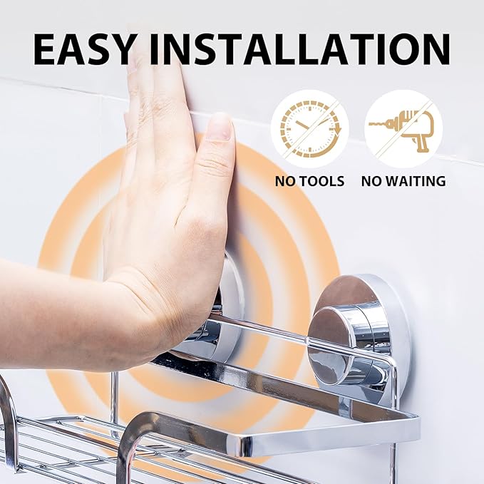 - Easy Installation: No drilling, no glue, no tools, and no waiting required to use the shower shelves. Simply choose a smooth and dry surface without any grout, take off the protective cover and push the board "PUSH" STRONGLY until you hear "PUFF", ONE second to complete the installation. The suction cup is removable without leaving any marks, so you can adjust installation position whenever you want