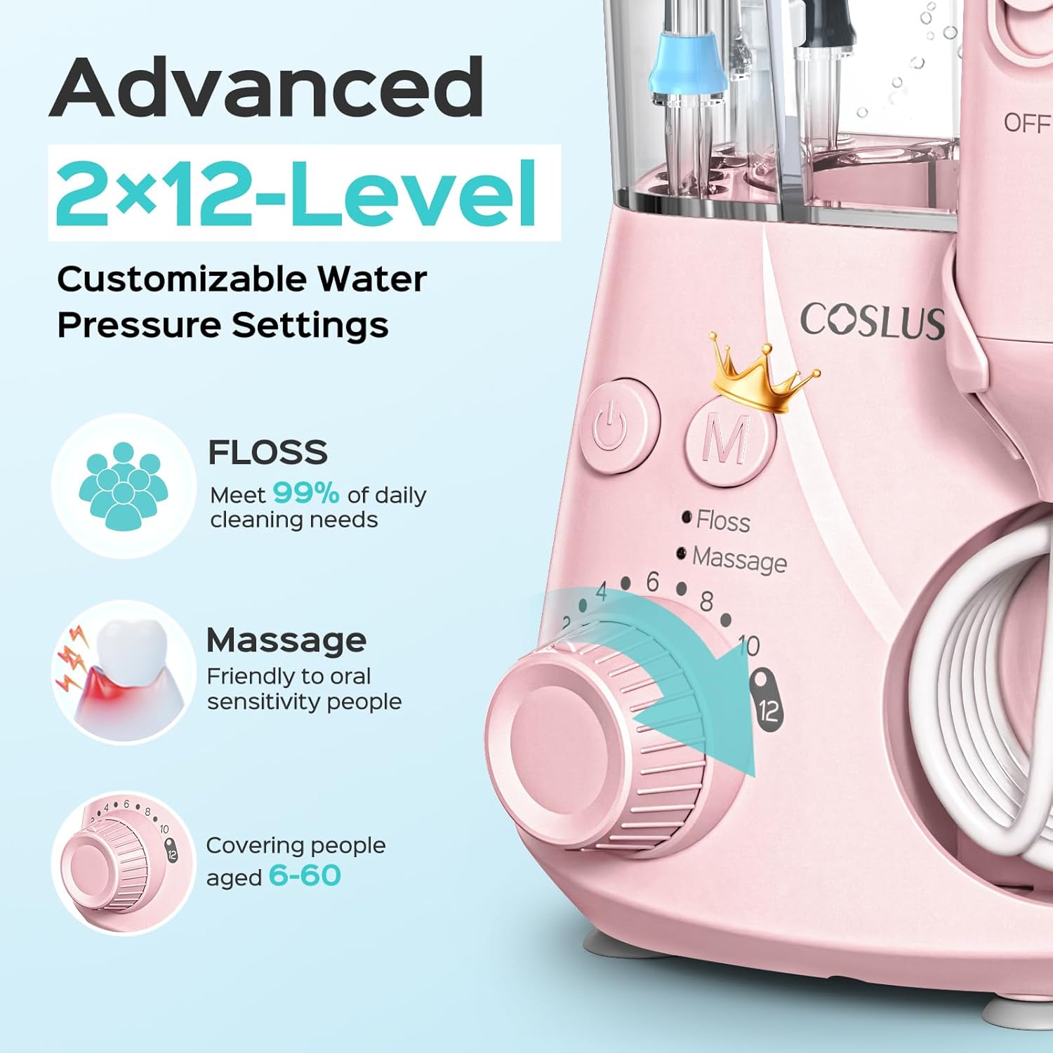 COSLUS Advanced Water Flosser for Teeth: 2 Modes & 12 Pressure Settings Electric Dental Pick for Orthodontic, Braces, Sensitive Gums - Home Use, 5 Jet Tips for Multiple Users, Family, Pink, E2