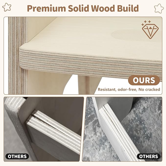 - This versatile wooden step stool is not only functional but also eco-friendly.Made from durable and sustainable wood, it is both strong and long-lasting. Its natural finish and it can withstand damp environments, making it ideal for use in the bathroom, kitchen, or bedroom. This makes it a great all-in-one tool for helping toddlers with various tasks around the house.