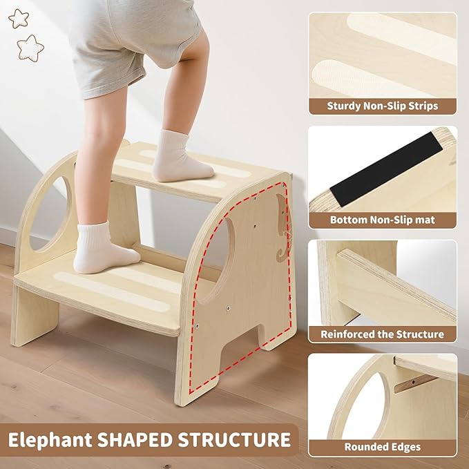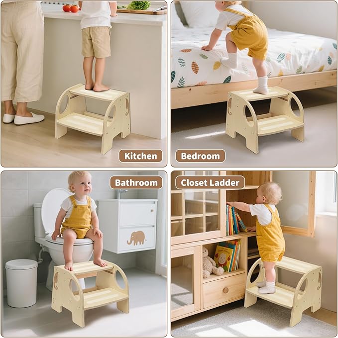 - This 2-step stool is a practical and thoughtful addition to any home.It encourages independence in a way that aligns with Montessori principles, allowing toddlers to take on responsibilities and tasks on their own. Whether for potty training, reaching the sink, or getting onto the bed, this step stool is a valuable tool for parents and a wonderful gift for little ones.