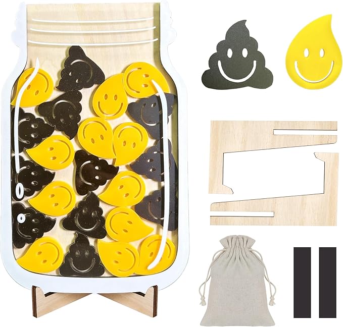 - 1. Complete Potty Reward Set Includes 1 wooden incentive jar, 25 themed acrylic tokens (cute poop & water drop shapes), 1 wooden stand, and 2 magnetic strips—everything parents need to support toilet training with fun rewards.
