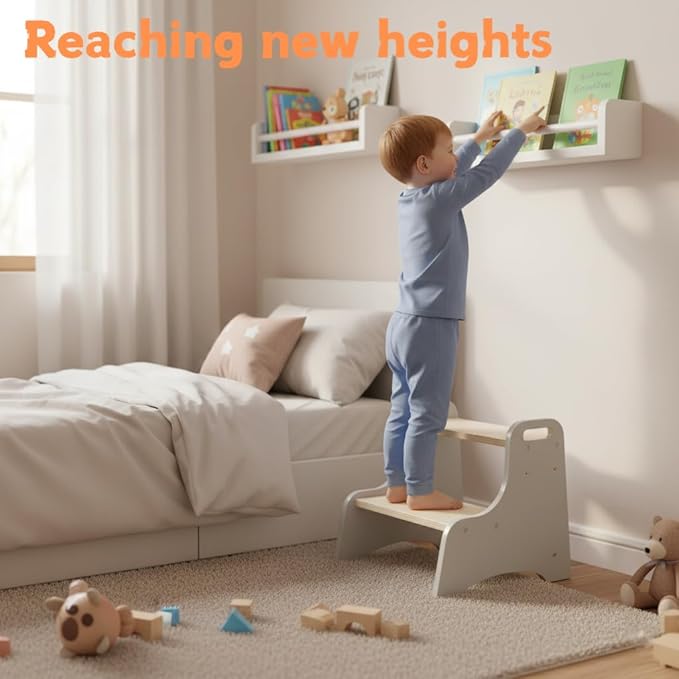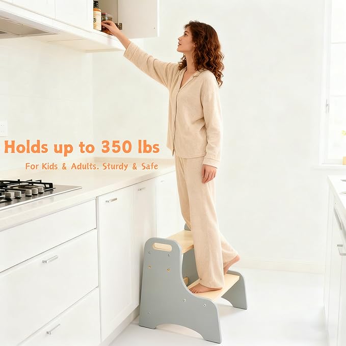 - đă Durable Two-Tone Wood BuildăCrafted from solid wood with a stylish grey two-tone finish, this step stool combines durability with modern aesthetics. The easy-clean surface is resistant to daily wear, while the sturdy construction supports long-term use. This step stool for kids offers both lasting reliability and visual appeal.