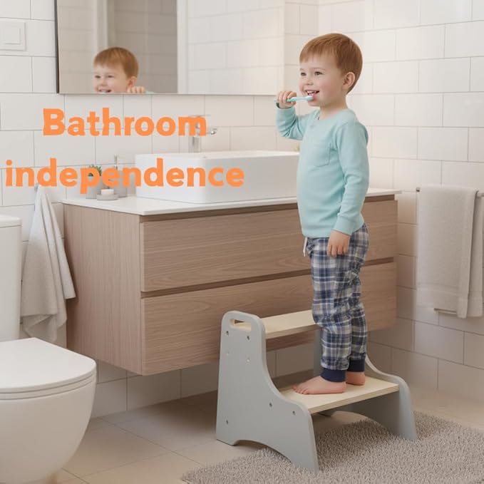 - đ ăVersatile for Every RoomăThe versatile grey step stool for kids seamlessly blends into your home decor. Itâs the perfect helper in the kitchen, bathroom for potty training or sink access, and bedside for independent climbing. This multi-use step stool supports both toddler independence and adult tasks around the house with its functional design.