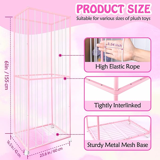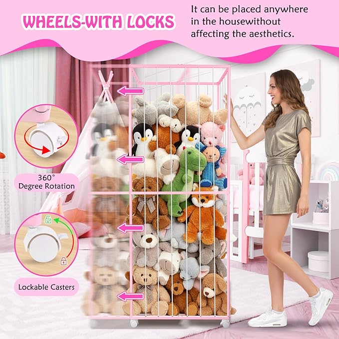 Stuffed Animal Storage, Metal Tube Extra Large Toy Storage Organizer with Brake Wheels, Stuffed Animal Holder Zoo Organizer for Nursery Playroom Kids Room Pink(61” x 23.6”x 16.5”)