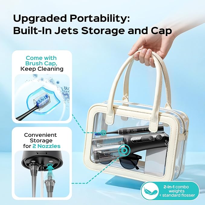 - Portable 2-in-1 Oral Care Combo: Combines a 45,000 strokes/min electric toothbrush with a water flosser featuring 18 adjustable pressure settings (3 modes × 6 intensities) in one device for complete oral care