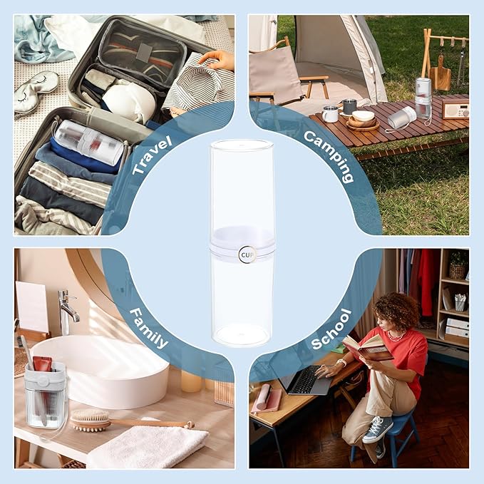 - Portable Design: This travel toothbrush case adopts a two-stage design, with detachable cups that double as mouthwash containers. The cup mouth is round and smooth, and will not scratch the skin or items in the bag, easy to grip and dust-proof