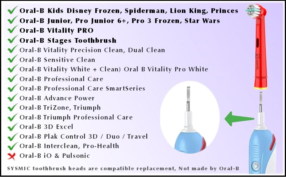 - Replacement Heads For Kids Brushes: Fully compatible with Oral-B electric toothbrushes for children (excluding iO, Pulsonic, and Sonic), SYSMIC kids toothbrush heads work seamlessly with character-themed series like Spiderman, Frozen, Disney, Lion King as well as standard models