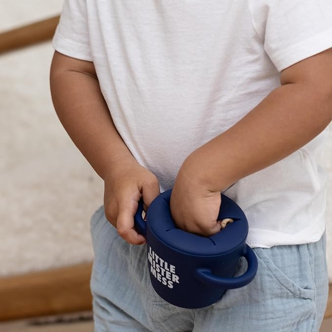 - LESS MESS, MORE MUNCHIES: "Little Mister Mess" snack cup is fun for toddlers and smart for parents; designed with soft silicone flaps, snap-tight lid, and two easy grip handles, this food container lets your little one reach in for treats while preventing spills