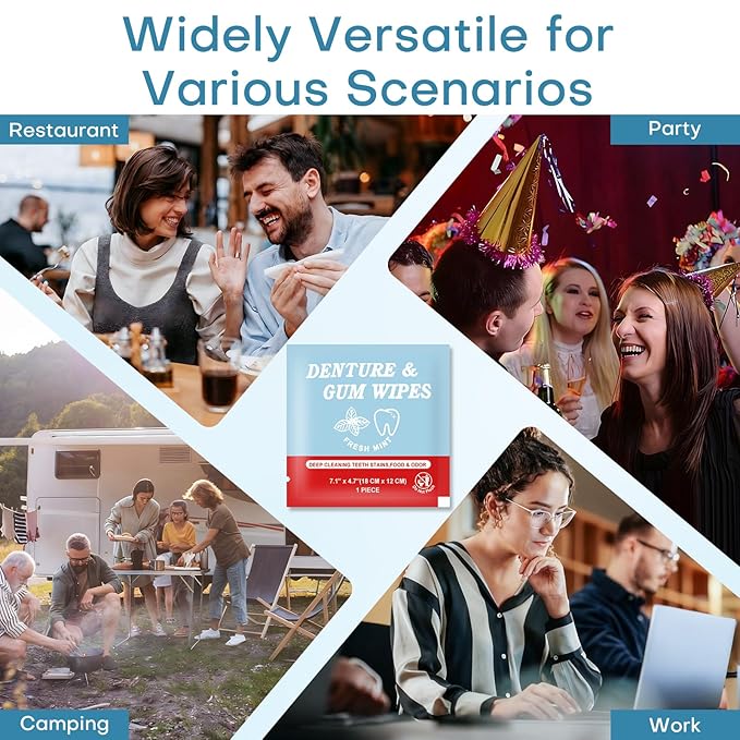 - Effective Cleaning for Dentures & Teeth:These denture cleaning wipes are designed to wipe away dirty things on your teeth or dentures , including denture adhesive, food debris, teeth stains, and mouth odors. maintain cleanliness of your mouth, dentures, retainers, and gums, making a fresh mouth anytime and maintain oral hygiene
