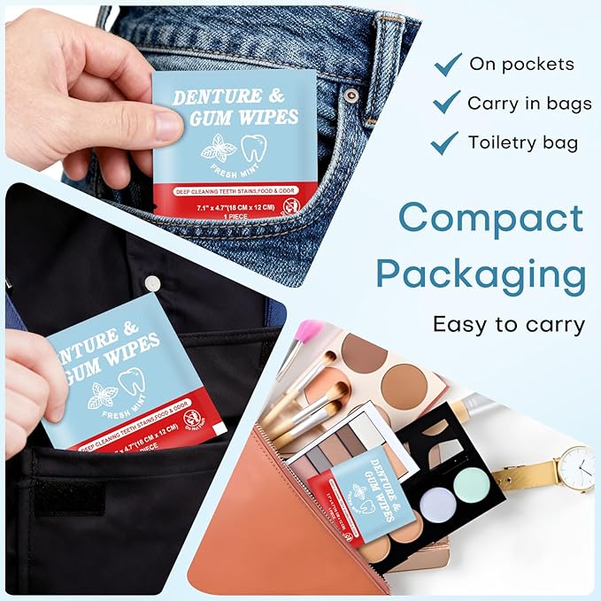 - Widely Versatile for Various Scenarios: Each Tooth Gums Wipes comes in individual packaging, making it more convenient to use in outdoors. Whether you’re at a restaurant, party, or even at work, you can easily clean your dentures, retainers anytime anywhere. These wipes are versatile, they can effectively clean your denture, retainer, aligner, mouth guard, and other oral accessories, helping extend the lifespan of dental appliances