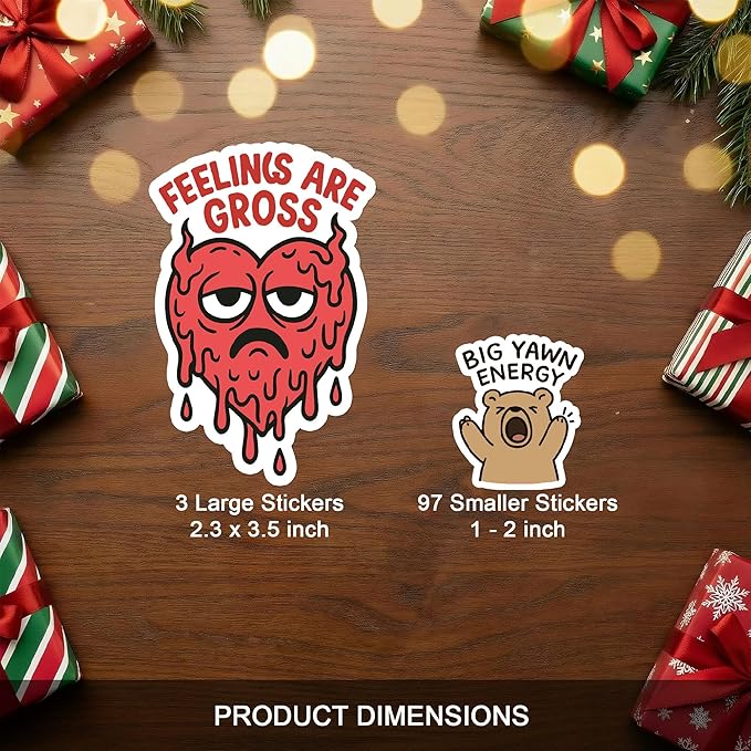 - 100 Funny Saying Stickers – A fun collection featuring witty quotes, hilarious sayings, and playful illustrations for humor lovers of all ages. Includes 3 large + 97 small stickers on 9 sheets.