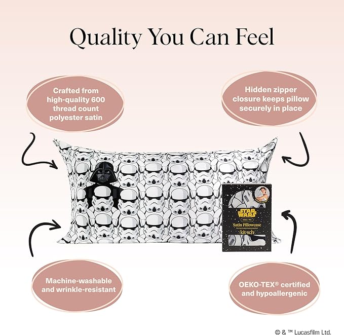 - LUXURIOUS STAR WARS SATIN PILLOWCASE – Say hello to smoother nights with the limited-edition Kitsch x Star Wars satin pillowcase, featuring (design). This luxe design blends fandom flair with beauty sleep essentials, making it more than just a pillow case—it’s a collectible and a perfect stocking stuffers for any Star Wars fan.