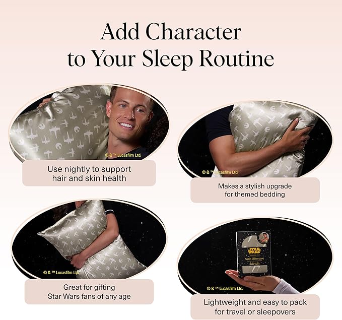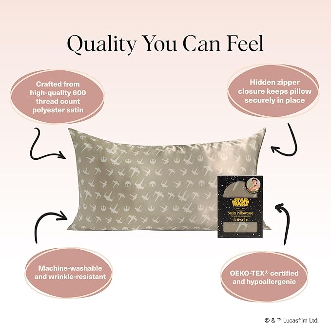 - LUXURIOUS STAR WARS SATIN PILLOWCASE – Say hello to smoother nights with the limited-edition Kitsch x Star Wars satin pillowcase, featuring Rebel Alliance. This luxe design blends fandom flair with beauty sleep essentials, making it more than just a pillow case—it’s a collectible and a perfect stocking stuffers for any Star Wars fan.