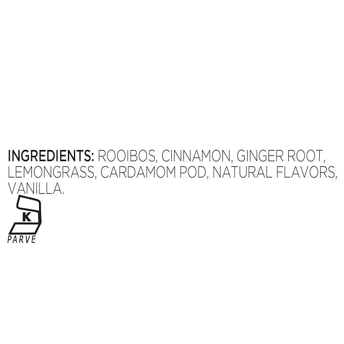 - INGREDIENTS - Rooibos, Cinnamon, Ginger root, Lemongrass, Cardamom pod, Natural Flavors, Vanilla.