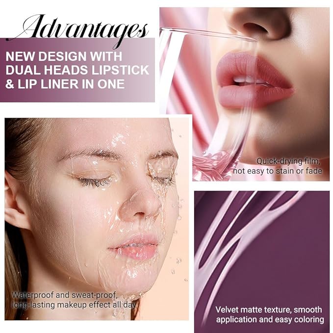 - 2 IN 1 Lip Liner & Matte Liquid Lipstick: The double ended design made you can use lipstick and lip liner on both ends. New design with dual heads lipstick & lip liner in one, for draw delicate lip line before applying lipstick. It combines lip line and metallic lipstick and makes double-end lipstick more perfect,meets the need of all occasions.