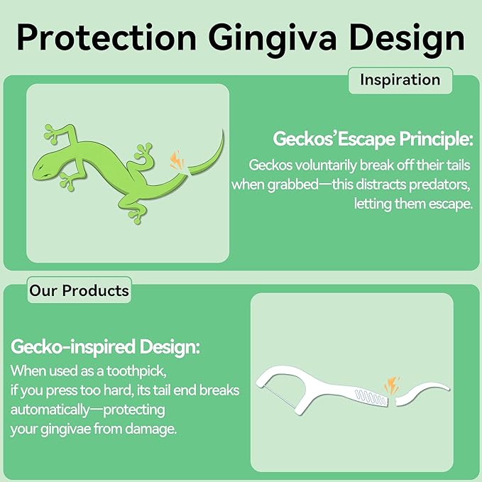 - DUAL-PROTECTION MECHANISM: Break-Safe Pick & Shred-Resistant Floss.The tail pick auto-breaks under excessive force to shield your gingivae from harm, and the ultra-tough floss resists fraying—delivering gentle yet thorough cleaning for a healthier smile.