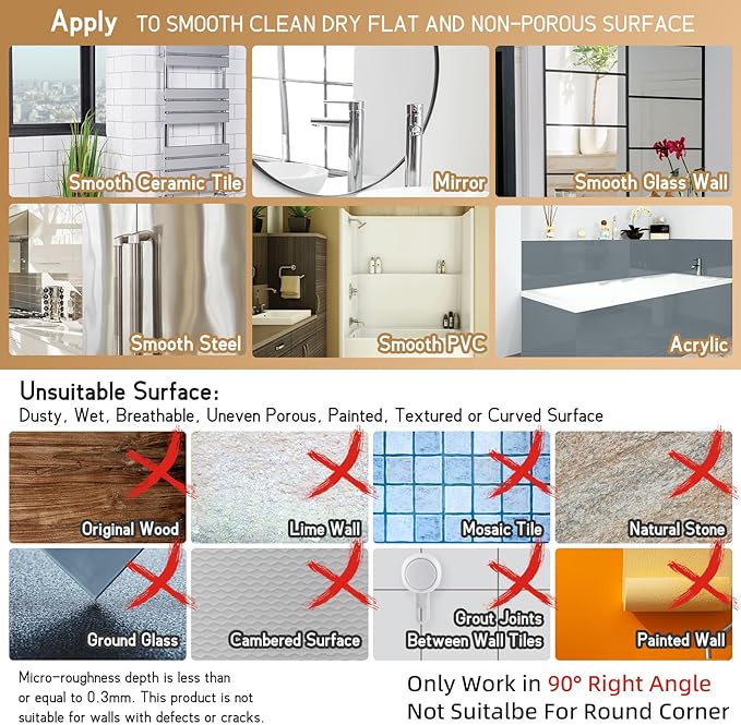 - Warn Tips: ONLY work for ceramic tile (uncracked), glass, mirror, polished metal, stainless steel and acrylic. Please don't stick to a grout line. NOT work for painted/dry wall, wood, wall paper or any other rough/crack wall. If problems when firstly installation, please wash the suction cup, dry it with hair dryer and test it on the smooth glass surface. If suction holds, that means initial wall might not applicable for using suction cup, please change installation location