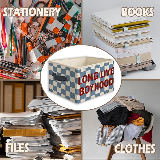 Long Live Boyhood Foldable Storage Bins Box with Handles, Retro Blue Checkered Collapsible Toys Books Clothes Organizer Basket for Kids Boys Nursery Bedroom Bathroom Dorm