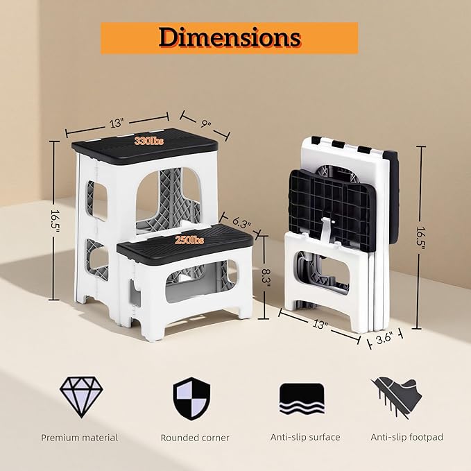 - Robust and Secure: Made of high-quality PP and finished with robust inbuilt structural , the folding step stool is sturdy and weight capacity up to 330 lbs, ensuring long-lasting use. The top of step stool for kids featuring a large and textured surface, robust trapezoidal framework, and anti-skid rubber feet, all round corners, the plastic step stool ensures utmost user safety on top of the kitchen step stool . Double platform locking, more stable.