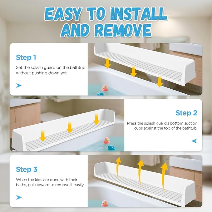 - Easy Installation and Removal: Splash guard for tub installs and removes in seconds with no tools required; Fits most standard‑size bathtubs; Keeps bath essentials organized and toys within reach while maintaining a secure barrier against splashes