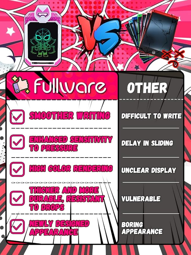 - AS TOUGH AS A SPIDER HERO! - Introducing the new Fullware Hero Series LCD writing tablet for kids, available in exciting designs such as Spider Hero Man, Captain M, Mech Iron Hero, and Green Giant Powerful Hero. The tablet boasts an upgraded thickened shell and a high-brightness, pressure-sensitive screen, enabling kids to create their favorite drawings with ease.