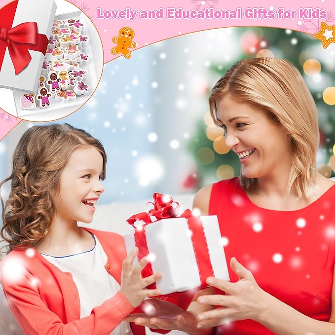 - Christmas Mini Erasers: The package comes with 60pcs pink gingerbread men erasers in 6 styles (Each style 10pcs). With the bright colors and cute shapes, it would be loved by children and add a lively atmosphere to the classroom.