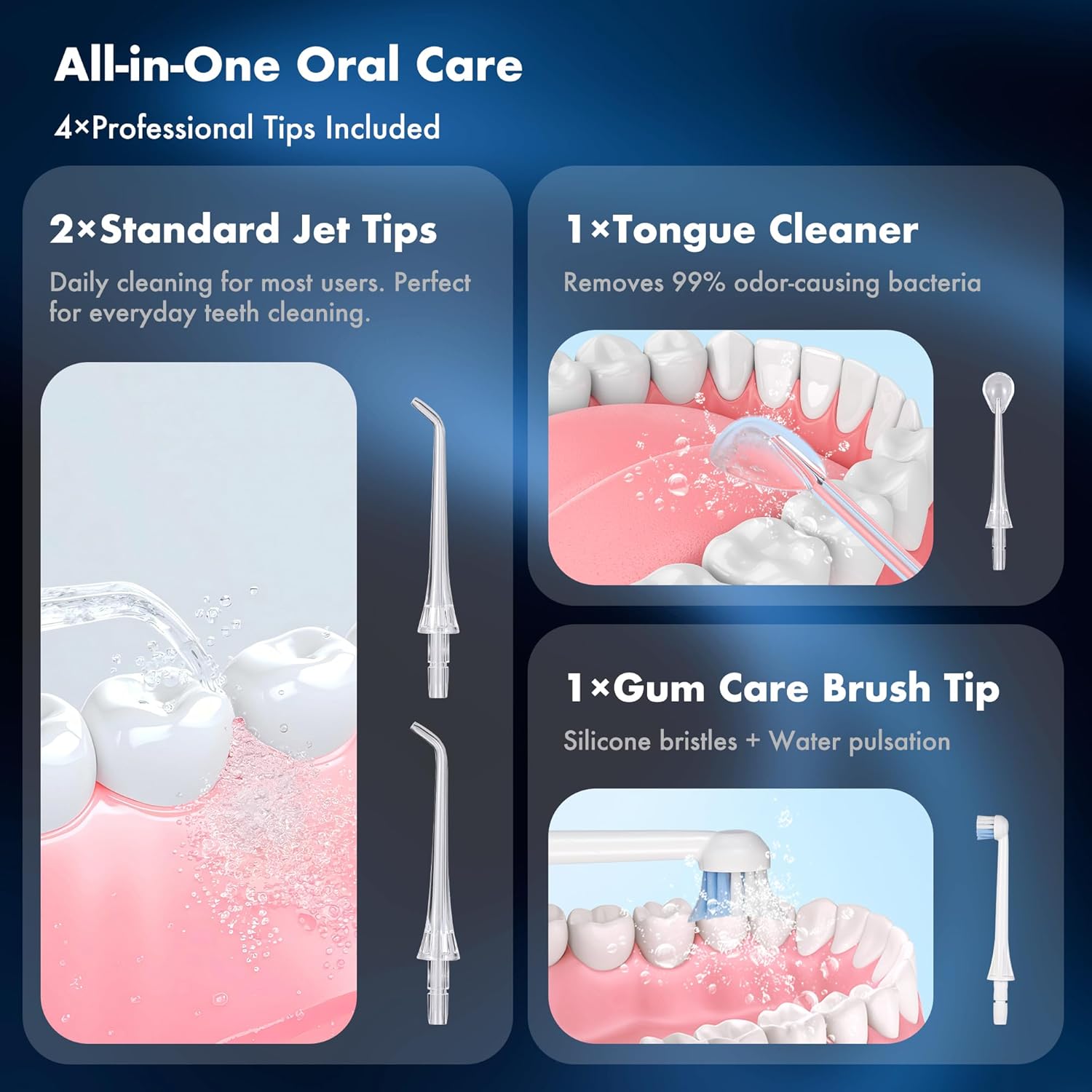 - 𝐂𝐨𝐦𝐩𝐥𝐞𝐭𝐞 𝐎𝐫𝐚𝐥 𝐂𝐚𝐫𝐞 𝐟𝐨𝐫 𝐄𝐯𝐞𝐫𝐲 𝐍𝐞𝐞𝐝 From orthodontic cleaning for braces water flosser users to gentle care for sensitive gums, plus tongue cleaning and stain removal, this 2-pack water flosser kit covers every smile in your home.