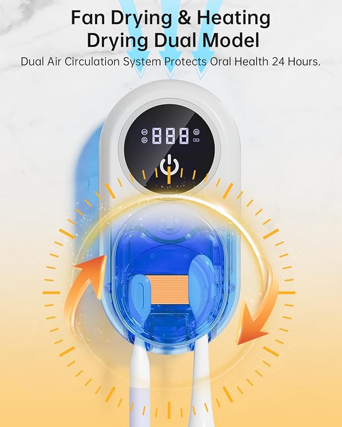 - 【Dual Cleaning Cycle & Heating Drying Mode】: This tooth brush sanitizer holder combines UV-C light with a gentle air/ warm heat drying system. This dual-action process not only sanitizes but also efficiently dries your toothbrushes, keep your toothbrush clean all day.