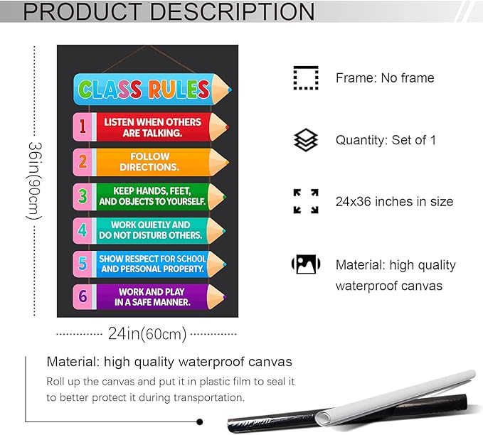- Enhances Classroom Atmosphere – The elegant canvas texture combined with vibrant colors instantly brightens any learning space. By making rules visually appealing and easy to notice, it naturally encourages students to follow guidelines and participate more actively in class.