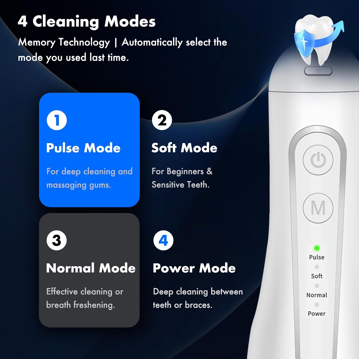 - 𝟏. 𝐅𝐨𝐮𝐫 𝐌𝐨𝐝𝐞𝐬 𝐟𝐨𝐫 𝐓𝐚𝐫𝐠𝐞𝐭𝐞𝐝 𝐂𝐥𝐞𝐚𝐧𝐢𝐧𝐠. Select from Soft, Pulse, Normal, or Power to match your needs – from gentle gum massage to deep cleaning around braces and dental work.