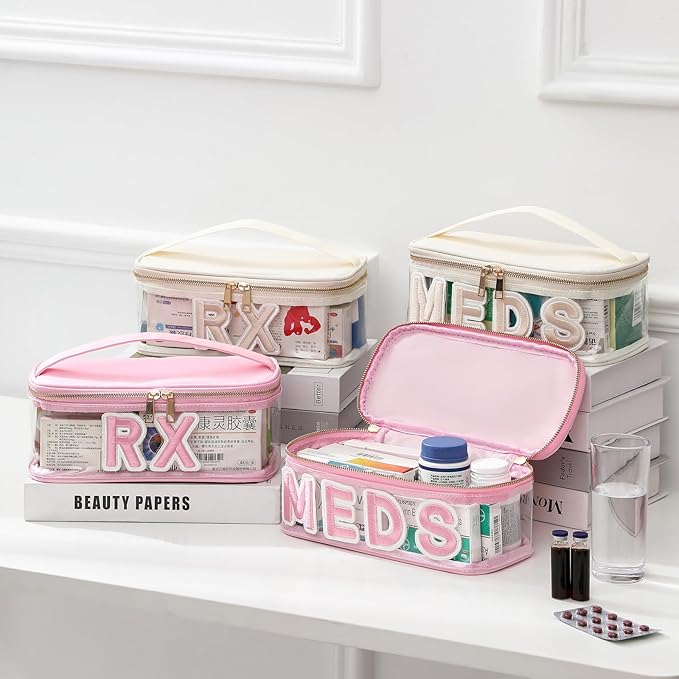 Clear Waterproof MEDS RX Makeup Bag,Transparent PVC Letter Patch medication travel case with Handle and Zipper, Portable Meds First Aid Travel Organizer Cosmetic Bag(04 Beige RX)