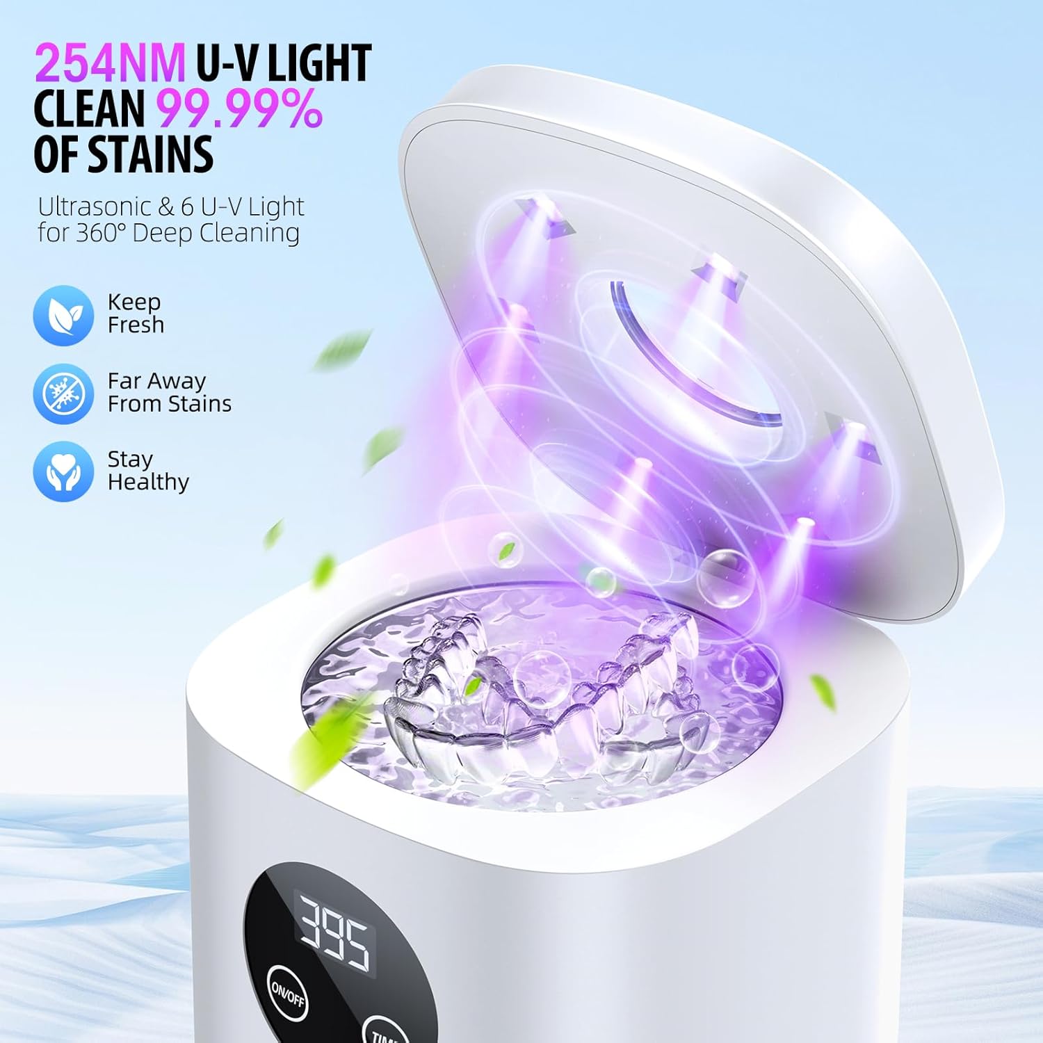 - 【6 Upgraded U-V Lights Care for Dental Appliances】The ultrasonic retainer cleaner equipped with 6 powerful U-V lights Bring all-round cleaning to your belongings, help clean lingering residue and odors—keeping them clean, fresh. Ultrasonic cleaner retainer will make your items look new and exude a fresh breath!