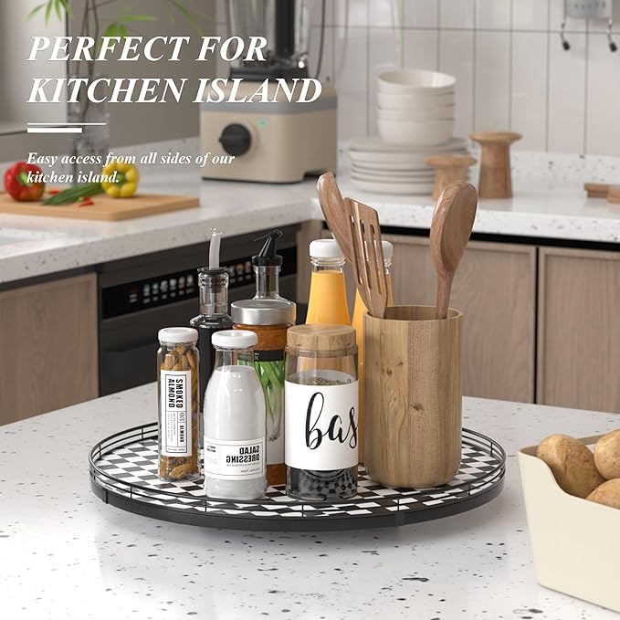 - CLASSIC BLACK AND WHITE CHECKERED DESIGN: A stylish black and white kitchen decoration plate with a sturdy iron frame, seamlessly blending with your black and white kitchen things to elevate your home decor. Perfect as a large decorative lazy Susan, a kitchen table centerpiece, or a table kitchen caddy, bringing both function and charm to your tabletop.