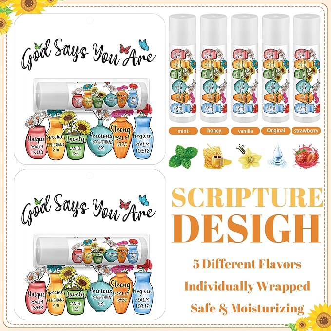 - Religious Moisturizing Lip Care: our moisturizing lip balms are printed with bible verse, they can express your gratitude and love to your guests and friends; The lip balm stick has a moisturizing and gentle effect, and can prevent lips from drying, cracking and premature ageing, it is soft, buttery and creamy with a hint of sweetness