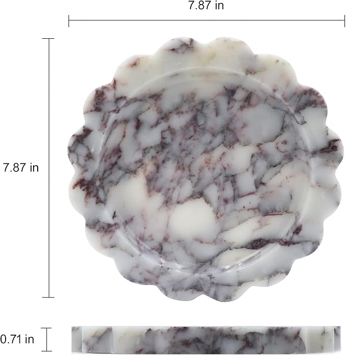 Round Marble Decorative Tray with Scalloped Edge, Luxury Natural Stone Bathroom Vanity Tray, Dresser Top Perfume Coffee Home Kitchen Sink Tray, Key Trinket Ring