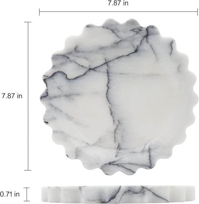 Round Marble Decorative Tray with Scalloped Edge, Luxury Natural Stone Bathroom Vanity Tray, Dresser Top Perfume Coffee Home Kitchen Sink Tray, Key Trinket Ring