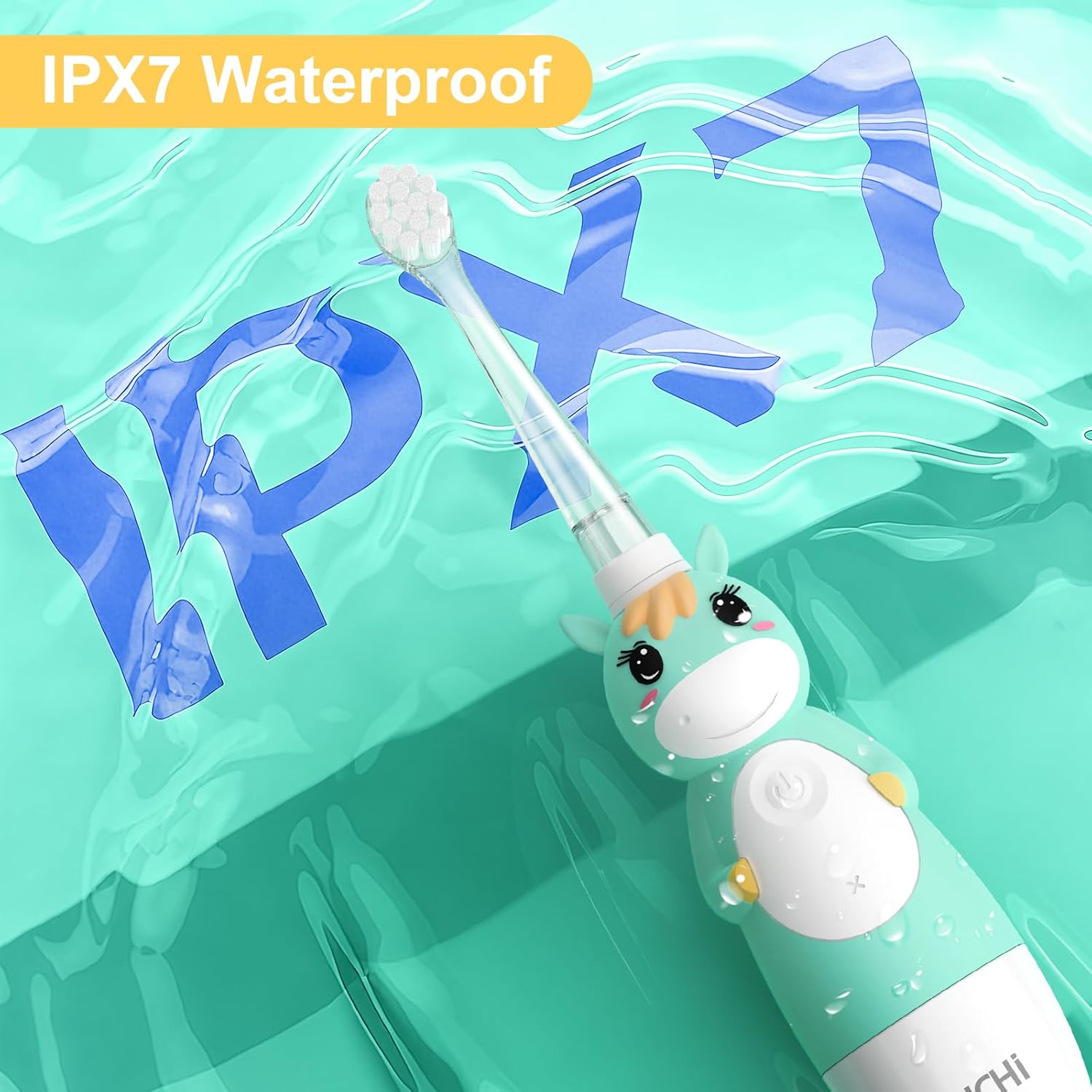 - SAFE BY DESIGN - This baby electric toothbrush features a quadruple-protection system including a securely sealed battery compartment, reinforced bristles with wrapped copper implantation to prevent shedding, a stable suction cup base to avoid falls, and IPX7 waterproof rating for worry-free use in wet environments.