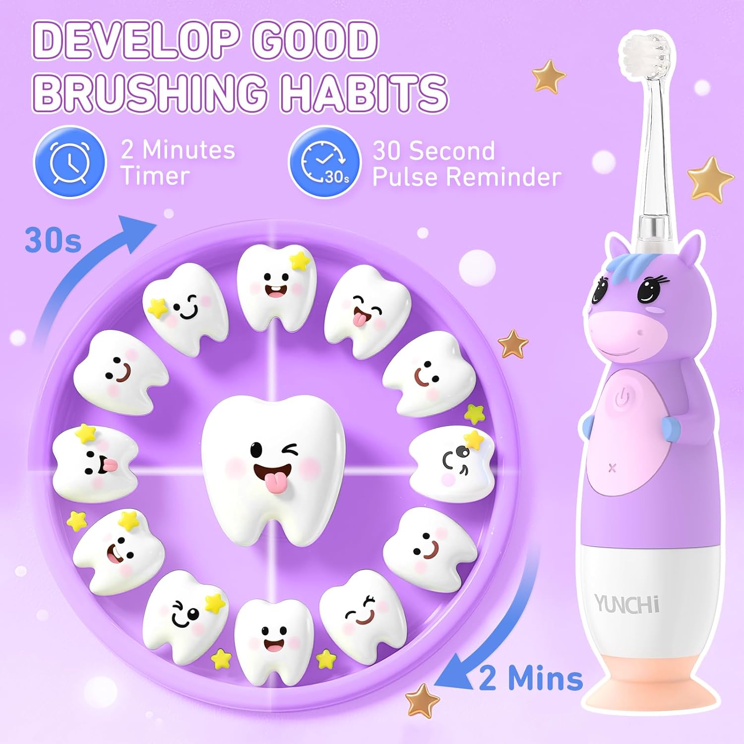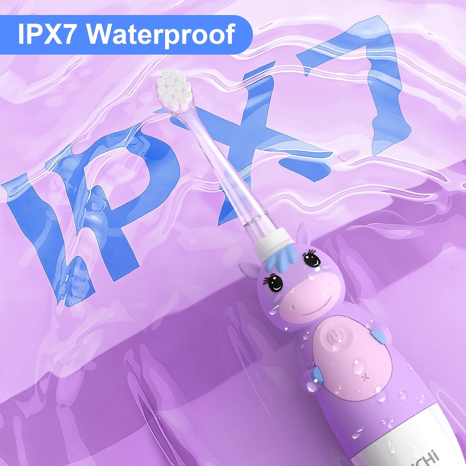 - FUN & KID-FRIENDLY DESIGN - This electric toothbrush features a playful colorful LED light that makes brushing enjoyable for kids. The handle is shaped like an adorable unicorn, specially designed to appeal to young children.