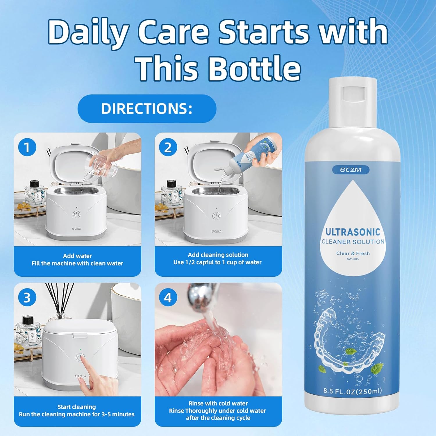 BCOM Ultrasonic Retainer Cleaner Solution, Jewelry Cleaner Solution Deep Clean for Retainer, Mouthguards, Night Guards, Aligners and Jewelry Ring, Odor Stain Remover for Cleaner 8.5 oz,2 Pack