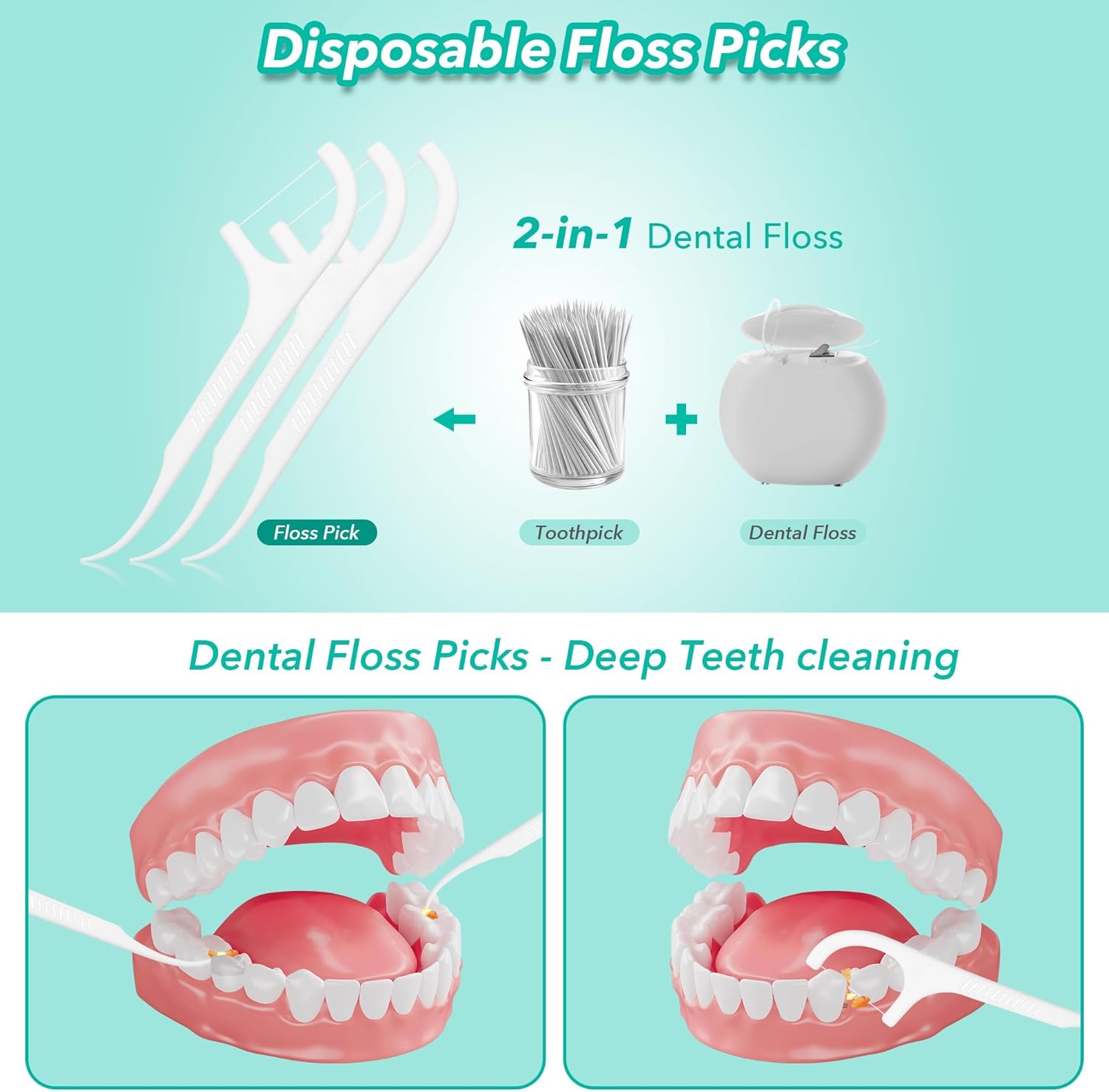 - 2-IN-1 CONVENIENCE: Floss & Pick in One. Each floss pick comes with a sturdy built-in toothpick at the end—ideal for dislodging trapped food and plaque your brush can’t reach. Twice the cleaning power in one simple tool