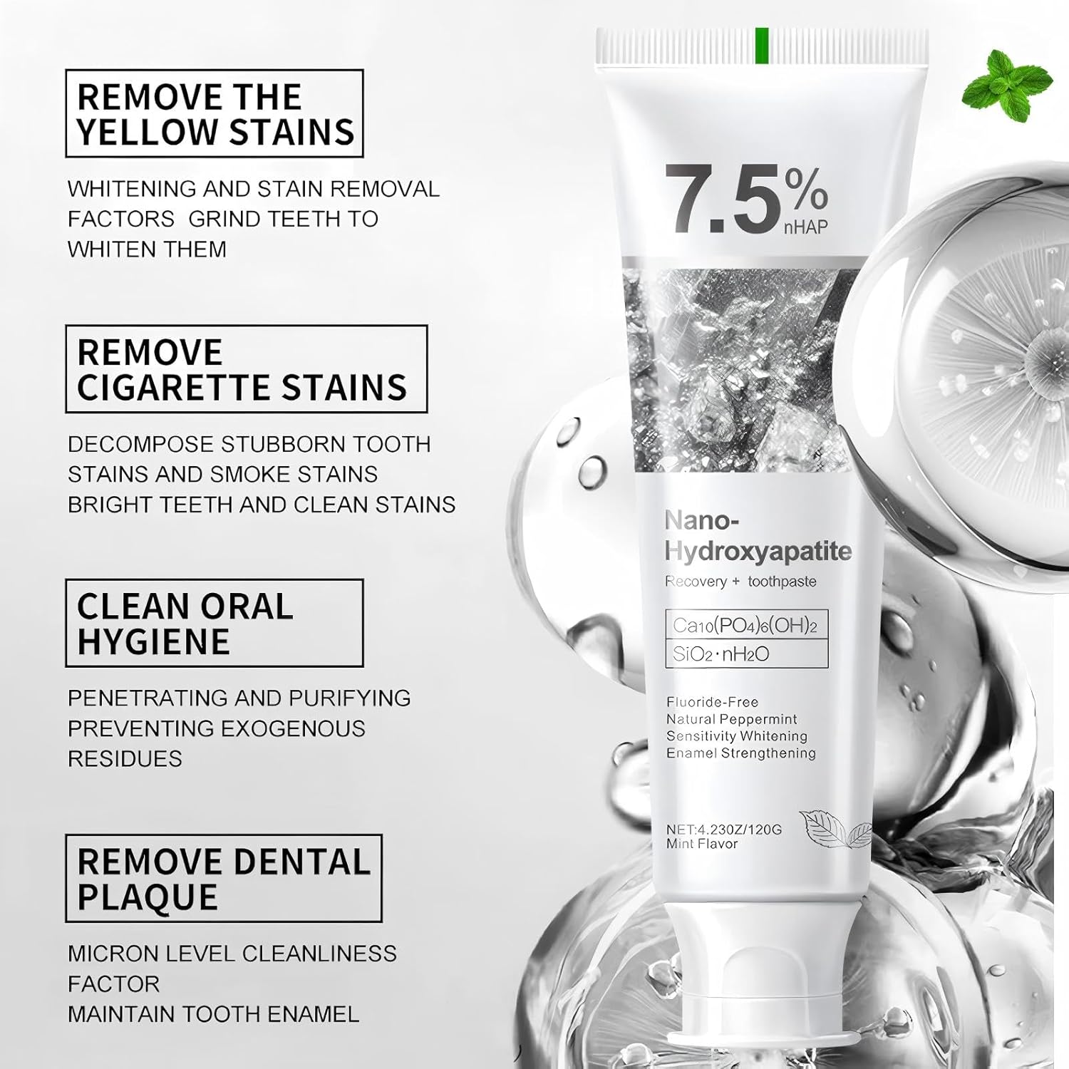 - 【7.5% Hydroxyapatite Toothpaste】Formulated with hydroxyapatite, a naturally derived mineral that actively repairs and reinforces tooth enamel while safeguarding teeth against daily wear and tear.