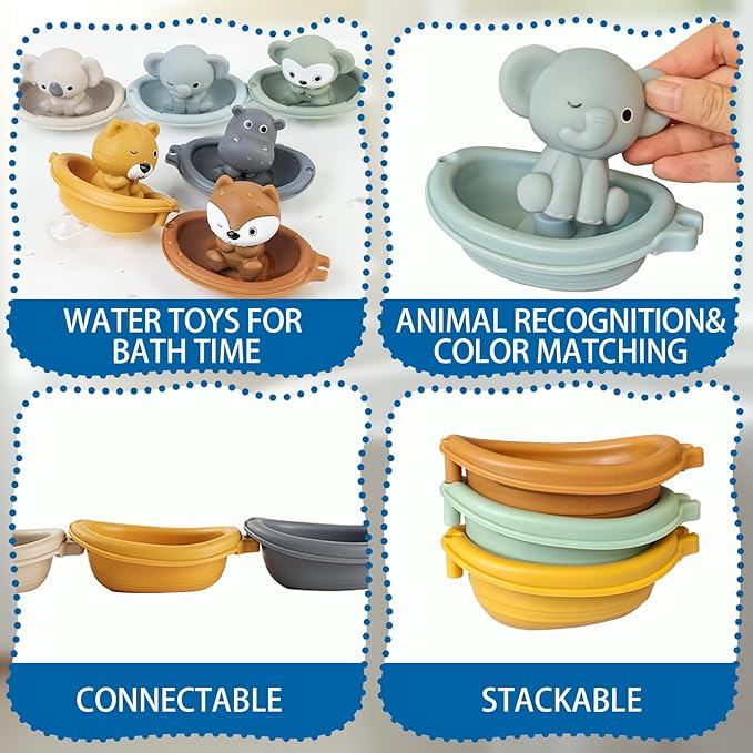 - EDUCATIONAL BATHTUB TOYS FOR KIDS: These fun bath toys comes with 6 versatile bath boats and 6 adorable animal finger puppets which parents and toddlers to create fun stories together while boosting social and communication skills. Through engaging activities like boat-and-puppet matching, the no hole bath toys help strengthen color recognition, tactile exploration, grasping ability, and fine motor skills. Turn every bath into a joyful learning experience that’s both entertaining and educational