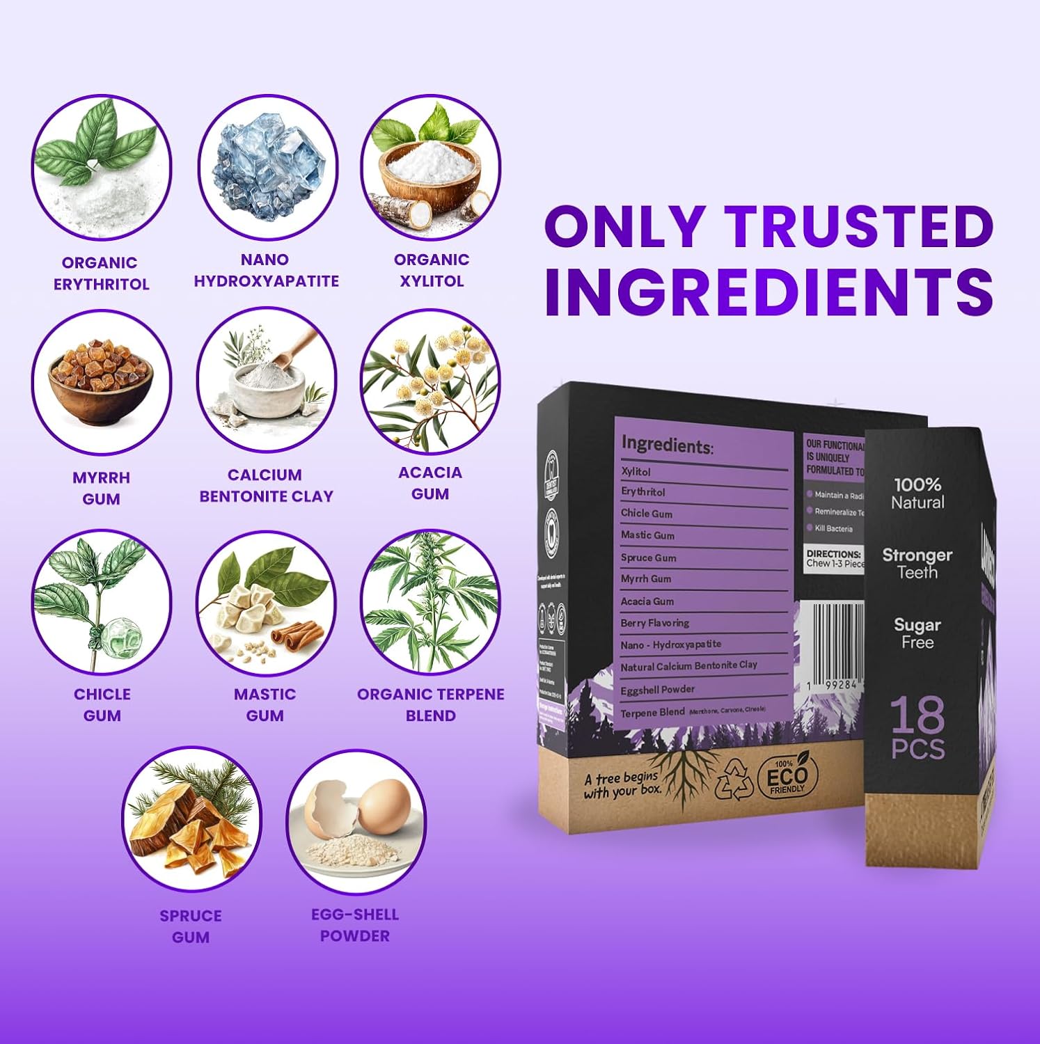 - Remineralizing Gum with Nano Hydroxyapatite: Formulated with nano hydroxyapatite, a mineral widely used in oral care to support strong teeth and clean chewing. Designed for use between brushings.
