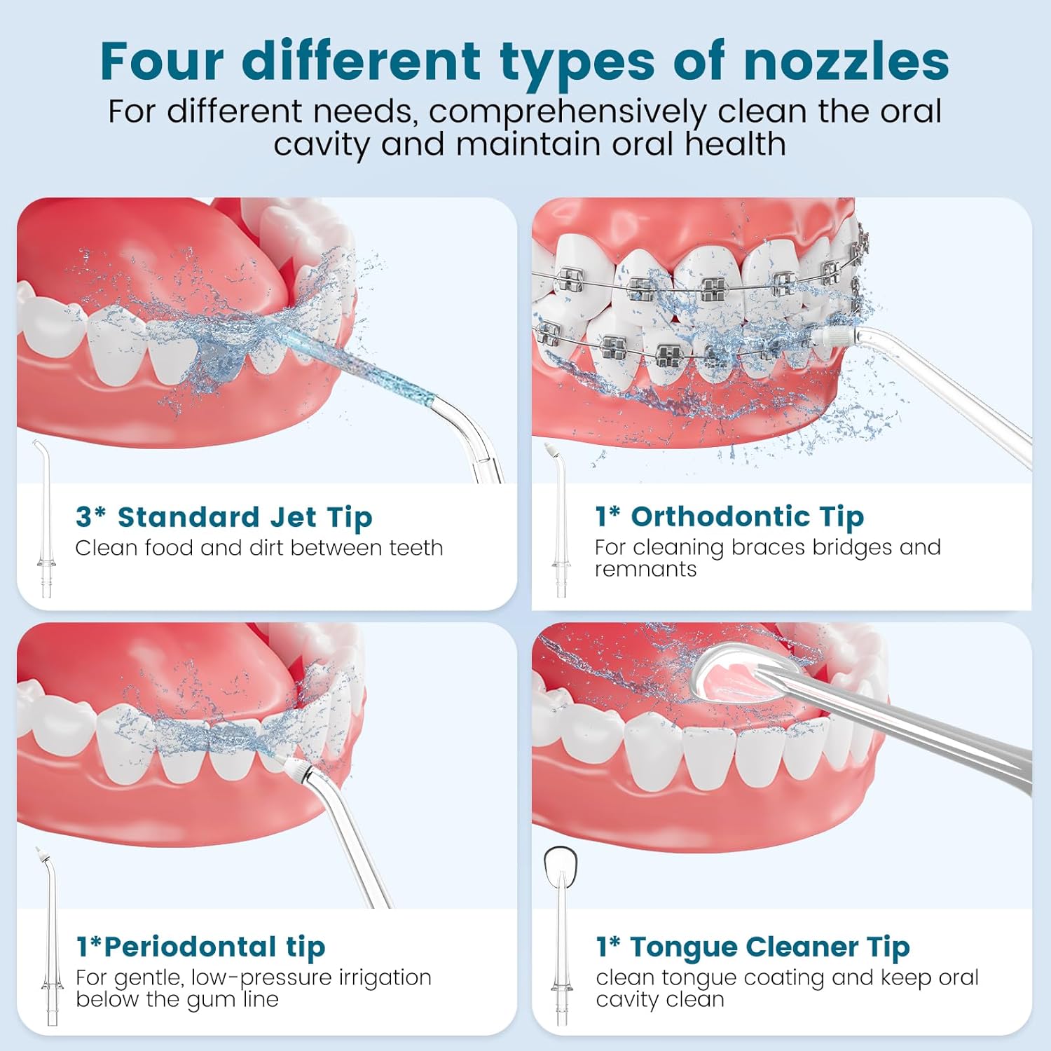 - 4 Specialized Nozzles for Complete Oral Care:Includes 3 standard nozzles for food debris removal, 1 orthodontic nozzle for braces and bridges, 1 periodontal nozzle for gentle gumline cleaning, and 1 tongue scraper nozzle for fresh breath. Perfect for braces, sensitive gums, and daily dental hygiene.