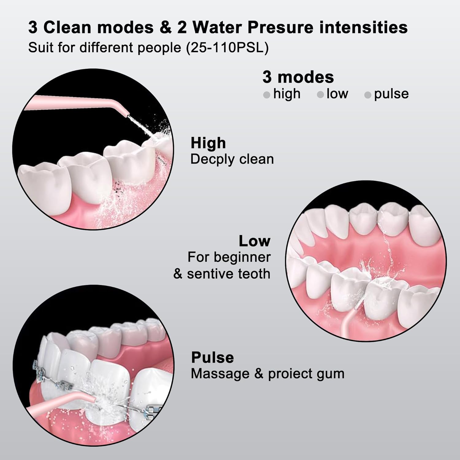 - 【Your Kids Perfect Flossing Choice】 This water flosser comes with a 155ml water tank and 1400 mAh battery that is easily recharged with the included USB cable, an IPX7 rated waterproof design that ensures no leaks, and an ergonomic handle that makes it a breeze to use. It has three cleaning modes for a complete oral cleaning experience. It even includes specialized tips for orthodontic care. It also includes deep cleaning and soothing massage modes to revitalize your gums and smile.