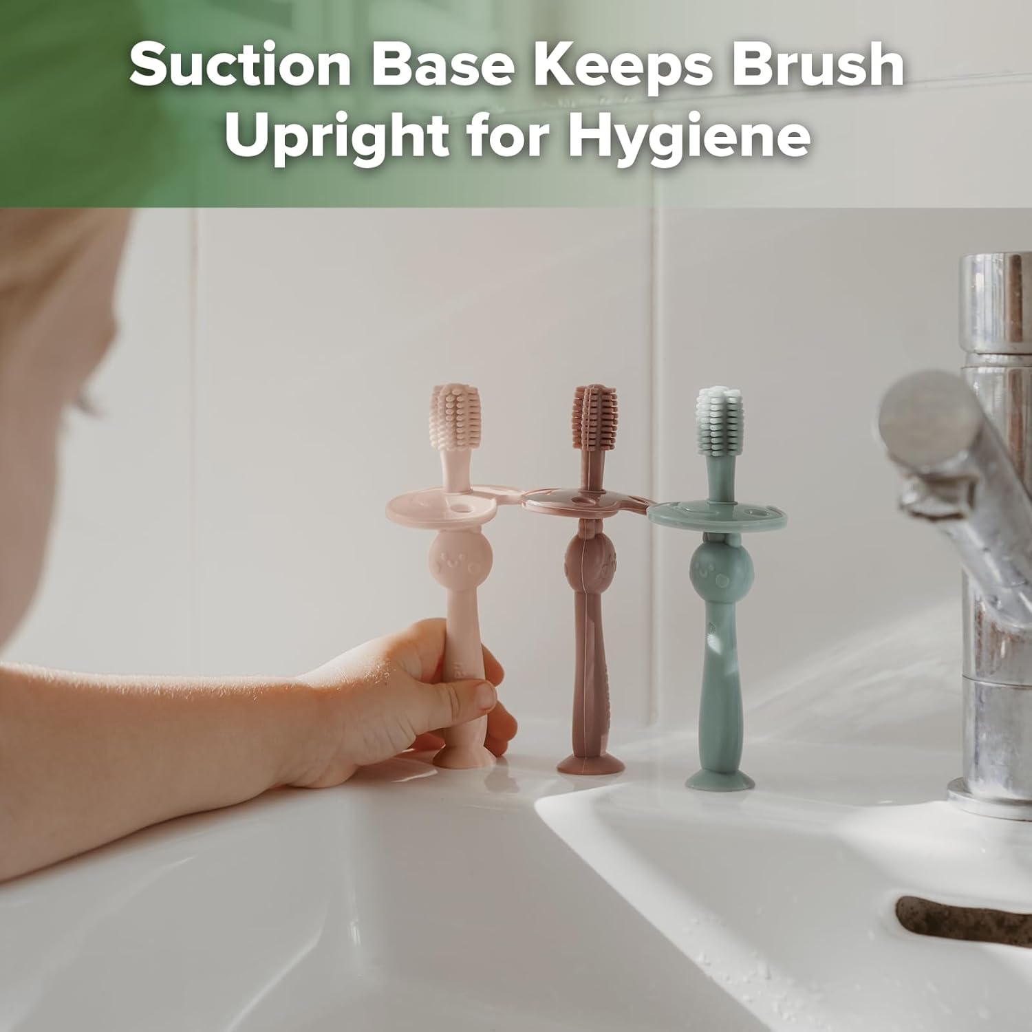 haakaa 360° Baby Toothbrush with Suction Base - Gentle Cleaning for Toddler's Self-Brushing Training, Food-Grade Silicone, Adjustable Safety Shield - Dusty Pink (1 Piece)